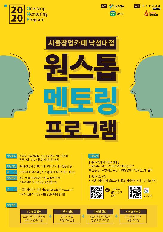 ‘원스톱 창업 멘토링’은 서울창업카페 낙성대점에서 주관하며, 기술창업, 소상공인 창업, MCN 및 크리에이터 분야 창업 관련 멘토링을 중점적으로 지원한다.