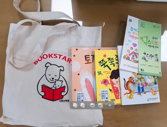 책꾸러미는 책을 넣을 수 있는 가방, 그림책 2권, 북스타트 가이드북, 북스타트 리플릿으로 구성되어 있다.