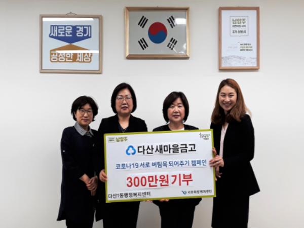 남양주시 다산새마을금고(이사장 김옥진)는 19일 다산행정복지센터(센터장 박세정)를 방문해 코로나19 극복을 위한 특별성금 300만원을 전달했다.