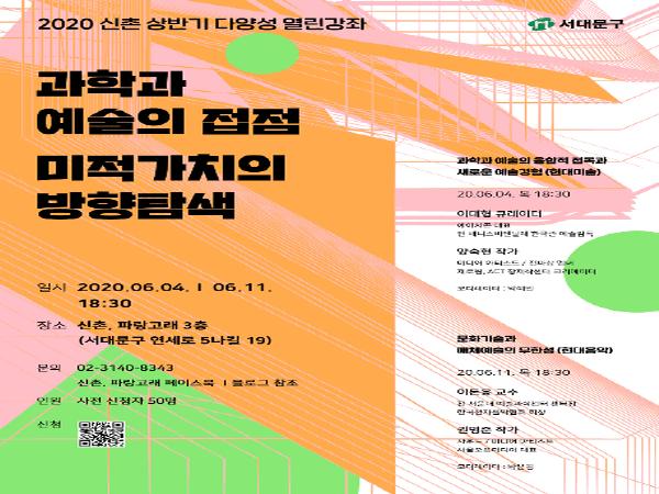 서대문구(구청장 문석진)는 6월 4일과 11일 오후 6시 30분 ‘신촌, 파랑고래’(연세로5나길 19) 3층 ‘꿈이룸홀’에서 ‘과학과 예술의 접점, 미적가치의 방향탐색’이란 주제로 2020 신촌 상반기 다양성 열린강좌를 개최한다.
