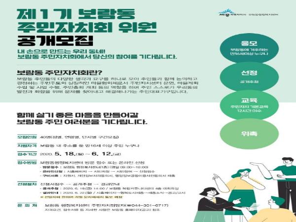 세종특별자치시 보람동(동장 진정옥)이 실질적인 주민주도 마을협의체로서 주민자치회 출범을 위해 ‘제1기 보람동 주민자치회 위원’을 공개모집한다.