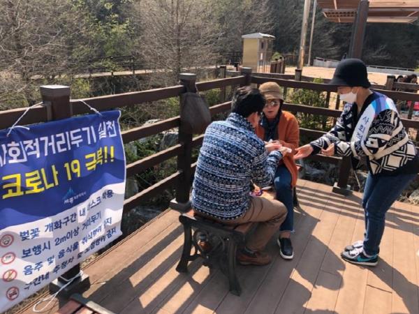연서면은 사람들의 손길이 많이 닿는 데크길 난간 및 손잡이 등을 집중 소독했고, 방문객에게 휴대용 손소독제 배부하면서 개인위생수칙을 홍보했다.