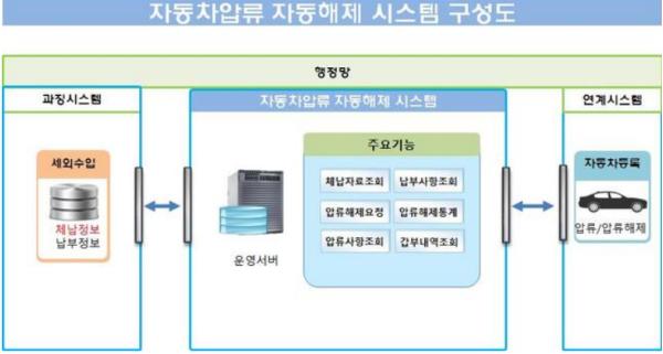 “100대 사업 행정혁신 과제” 중 하나인 자동차 압류 자동해제 시스템은 세외수입정보시스템상의 수납내역을 3분마다 확인하여, 압류에 관계되는 자동차관련 체납과태료가 납부되면 자동차관리정보시스템과의 연동을 통해 실시간으로 압류를 자동 해제하는 시스템이다.