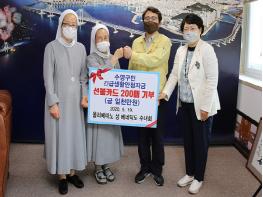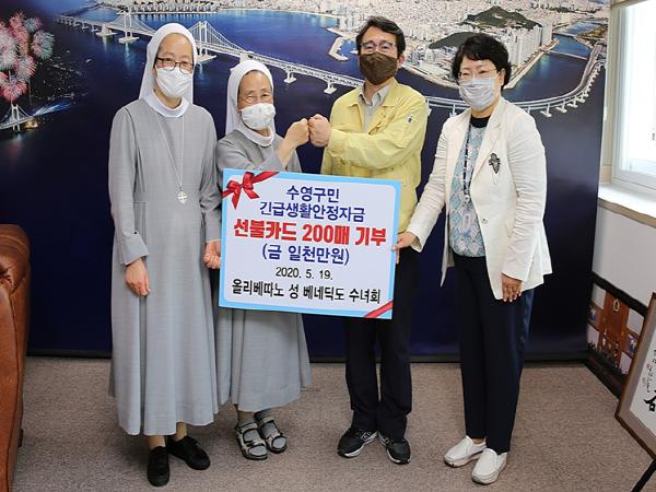 수영구(구청장 강성태)는 2020. 5. 19.(화) 구청장실에서 관내 성 베네딕도수녀회(총원장 에노스, 수녀회 거주 주민등록자 411명)로부터 코로나19위기를 극복하기 위해 지급한 긴급생활안정자금 선불카드200매(1천만원)를 기부