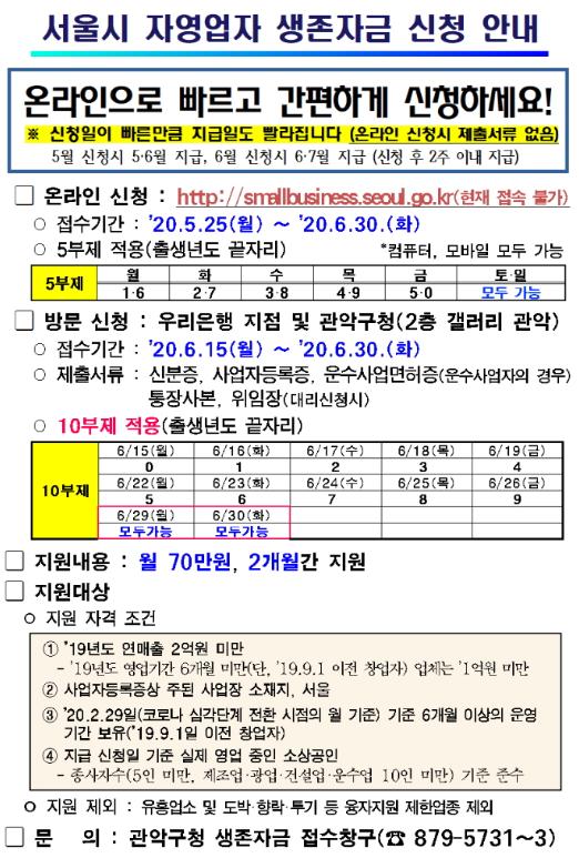 ‘온라인접수’는 5월 25일(월)부터 6월 30일(화)까지 진행되며, PC 또는 모바일을 이용해 서울시 자영업자 생존자금 홈페이지에서 간편하게 신청할 수 있다.