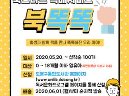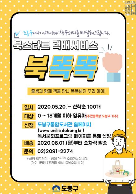 도봉구(구청장 이동진)가 코로나19 확산에 따라 영·유아 독서지원을 위한 북스타트 꾸러미를 집에서 안전하게 받아 볼 수 있도록 택배서비스 ‘북똑똑’ 서비스를 시행한다.
