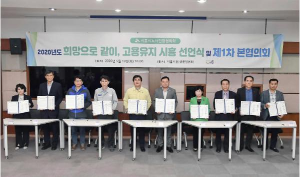 시흥시(시장 임병택)와 경제인단체 및 노동단체는 19일 시흥시 글로벌센터에서 코로나19 고용위기 극복을 위한 고용 유지 공동 선언문을 채택했다.
