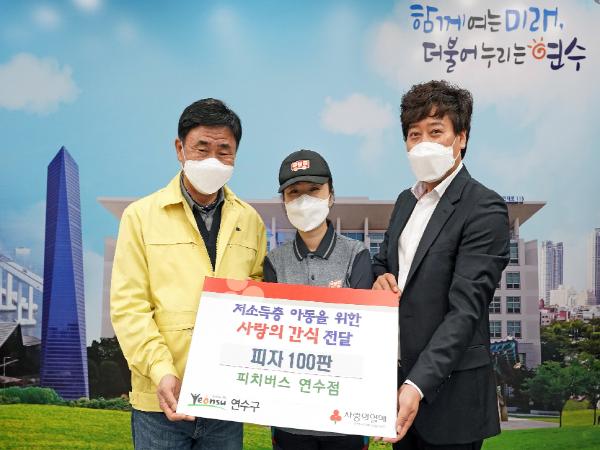 연수구(구청장 고남석)는 지난 19일 피치버’S 연수점(가맹주 변연숙)으로부터 사랑의 간식 피자 100판을 전달 받았다.
