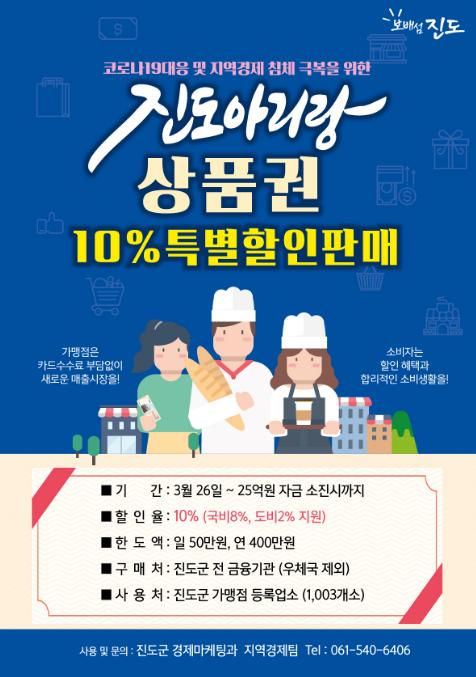 진도군 경제마케팅과 관계자는 “이번 특별할인판매와 정책발행분 조기 지급으로 코로나19로 매출이 급감한 지역 소상공인들에게 힘이 되고, 경제적 어려움에 조금이나마 기여했으면 하는 바램이다”고 말했다.