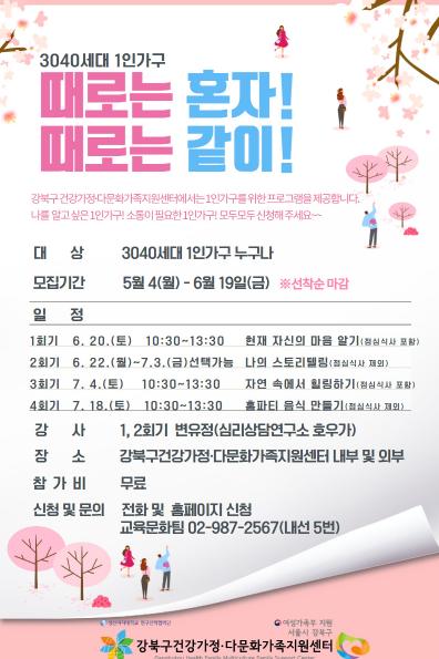 강북구(구청장 박겸수)는 강북구건강가정·다문화가족지원센터(센터장 한은주) 주관으로 3040세대 1인가구를 위한 자기돌봄 프로그램 ‘때로는 혼자! 때로는 같이!’를 운영한다.