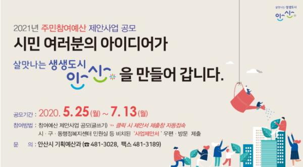 안산시(시장 윤화섭)는 주민들의 예산편성 등 참여를 확대시키고 다양한 의견을 반영하기 위해 2021년 주민참여예산 제안사업 공모를 진행한다고 21일 밝혔다.