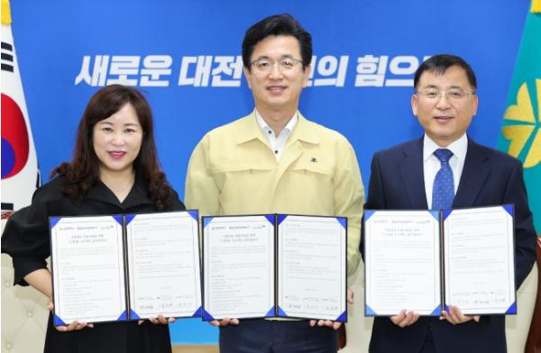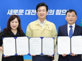 허태정 대전시장과 김선관 한국전력공사 대전세종충남본부장, 박미애 초록우산어린이재단 대전지역본부장은 21일 오후 2시 시청 응접실에서 드림 업! 프로젝트 업무협약을 체결했다.