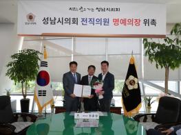 성남시의회(의장 박문석)는 21일 전준민 전 의원을 일일 명예의장으로 위촉하며 전?현직 의원 간 화합의 시간을 가졌다.