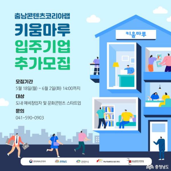 충남정보문화산업진흥원(원장 맹창호, 이하 진흥원) 콘텐츠코리아랩은 도내 예비 창업자 및 문화콘텐츠 스타트업의 안정적인 성장 지원을 위해 입주기업을 추가 모집한다고 21일 밝혔다.