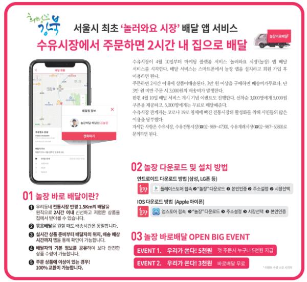 이번 서비스는 모바일을 이용한 상품구매가 보편화된 상황에서 소비자 구매형태에 맞춰 발 빠르게 대처하기 위한 조치다. 강북구, 시장상인회(수유시장, 수유전통시장, 수유재래시장), 스타트업 기업(WIJU)이 함께하는 사업으로 배달앱인 ‘놀장’(놀러와요 시장)을 통해 진행된다.