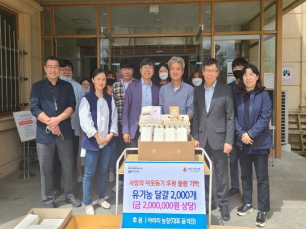 포천시 소흘읍 고모리 소재 아라리 농장(대표 윤석진)은 지난 20일 저소득 가정에 후원하고자 유기농 계란 2천 개(2백만원 상당)를 포천시에 전달했다.