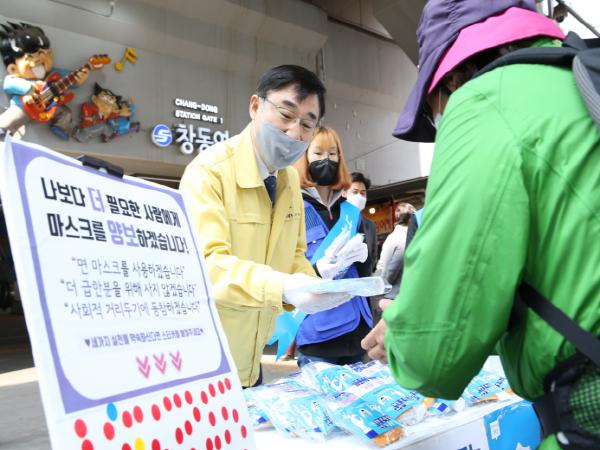 4월 3일 도봉구청장은 창동역에서 자원봉사자들과 함께 KF80 이상보건용 마스크를 기부하는 주민들에게 면마스크와 휴대용손소독제를 교환해 주었다.