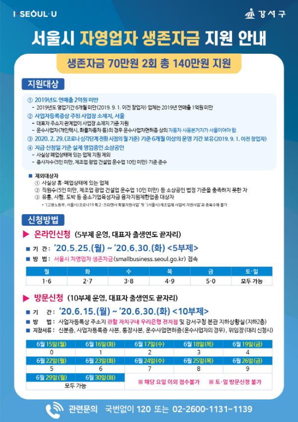 또한 ‘방문접수’는 사업자등록증, 통장사본 등 필요서류를 구비해 관내 우리은행 전 지점이나 강서구청 생존자금 접수처(강서구 화곡로 302, 강서구청 본관 지하 2층)에서 하면 된다.