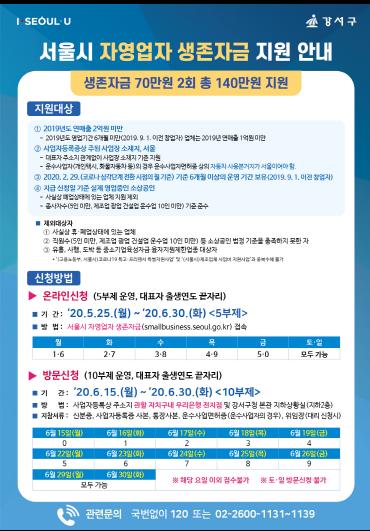 또한 ‘방문접수’는 사업자등록증, 통장사본 등 필요서류를 구비해 관내 우리은행 전 지점이나 강서구청 생존자금 접수처(강서구 화곡로 302, 강서구청 본관 지하 2층)에서 하면 된다.