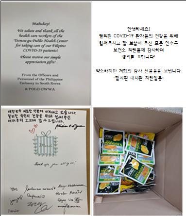 또 필리핀 대사관 직원일동 이름으로 “안녕하세요! 필리핀 COVID-19 환자들의 건강을 위해 힘써주시고 잘 보살펴 주신 모든 연수구 보건소 직원들께 감사하며 경의를 표합니다! 약소하지만 저희의 감사 선물들을 보냅니다”라는 글과 함께 낱개 포장된 특산물 건망고 10kg도 들어 있었다.