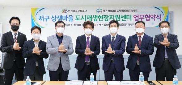 인천서구문화재단은 지난 19일 인천서구 상생마을 도시재생 현장지원센터와 석남동 상생마을 문화적 도시재생을 통한 지역문화진흥 업무협약(MOU)을 체결했다. 업무협약식은 인천서구문화재단과 서구 상생마을 도시재생 현장지원센터, 인천 서구 도시재생경관과 관계자가 참석한 가운데 진행됐다.