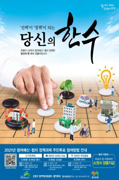 은평구(구청장 김미경)는 2021년도 참여예산·협치 정책과제 선정을 위해 매년 개최하는 주민총회를 코로나19로부터 감염병 전염을 예방하고 더 많은 주민이 손쉽게 참여할 수 있도록 전국 최초로 온라인 주민총회로 진행한다고 밝혔다.