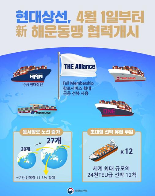 해양수산부(장관 문성혁)는 우리나라 대표 원양국적선사인 현대상선 주식회사가 4월 1일부터 신(新) 해운동맹(‘디 얼라이언스’) 체제의 협력을 본격 개시하고, 사명도 ‘에이치엠엠 주식회사(HMM)’로 변경함으로써 새로운 출발을 하게 된다고 밝혔다.