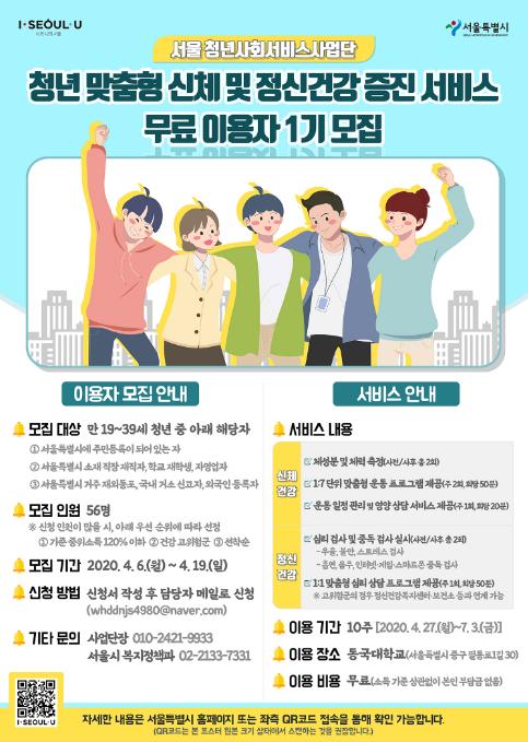 모집 대상은 만 19~39세* 청년 중 ①서울시민, ②서울시 소재 직장 재직자·학교 재학생·자영업자, ③서울시 거주 재외동포·국내 거소 신고자·외국인 등록자에 해당하는 자로 신체 및 정신건강 증진 서비스에 관심 있는 청년이라면 누구나 신청 가능하다.