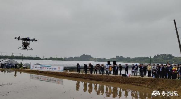 충남도 농업기술원은 25일 공주시 탄천면 일원에서 ‘드론 이용 벼 직파 연시회’를 개최했다.