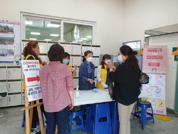 인천시 남동구 남촌도림동 통장협의회가 지난 18일부터 긴급재난지원금 현장 접수의 안전하고 원활한 진행을 위해 봉사활동을 펼치고 있다.