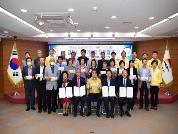 김천시와 4개 사회단체는 친절, 질서, 청결 등의 기초질서를 함양하여 상대방을 배려하는 친절 도시 기반을 조성하기 위해「Happy Together 김천」운동의 구체적 실천 동참을 약속하며, 협약서에 서명하고 상호 교환하였다.