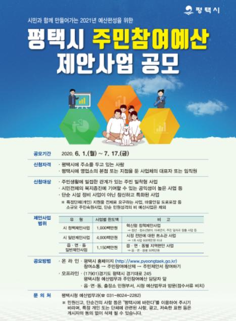 평택시(시장 정장선)가 6월 1일부터 7월 17일까지 2021년 예산편성을 위한 2020년도 주민참여예산 주민제안사업 공모 접수를 진행한다.