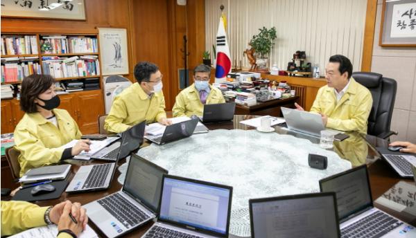 노현송 구청장은 26일(화) 오전 10시 구청장실에서 부구청장, 국장, 관련 부서장이 참석한 가운데 미술학원 관련 코로나19 긴급대책회의를 갖고 지역 내 감염을 막기 위한 총력 대응을 지시했다.