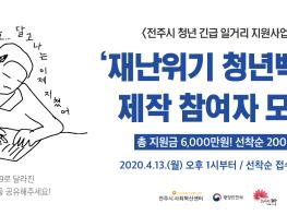전주시와 전주시 사회혁신센터는 코로나19 전주시 청년 긴급 일거리 지원사업의 일환으로 ‘재난위기 청년백서’제작에 참여할 청년 200명을 13일 오후 1시부터 선착순 모집한다.