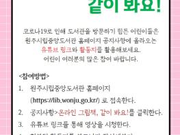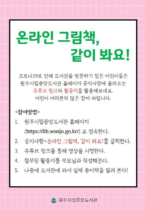 먼저 어린이를 대상으로 하는 온라인 그림책 활동은 도서관 홈페이지(lib.wonju.go.kr) 공지사항에서 ‘온라인 그림책, 같이 봐요!’를 클릭 후 유튜브 링크를 통해 영상을 시청하고 부모님과 함께 활동지를 작성해 보는 프로그램이다.