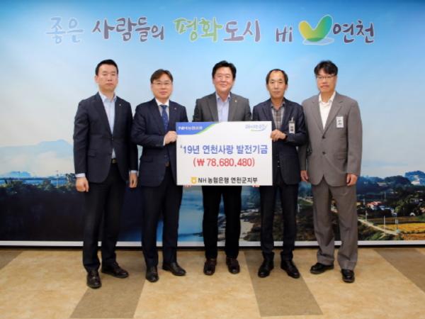 NH농협은행 연천군지부 이재진 지부장은 4월 6일 김광철 연천군수에게 지난해 적립된 총7,868만원의 연천사랑 발전기금을 전달했다.?