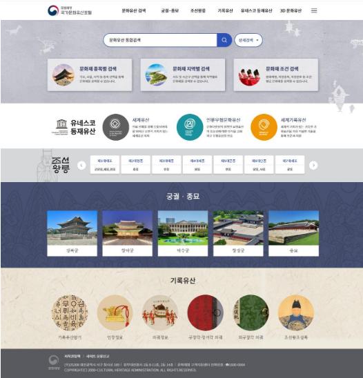 국가문화유산포털은 국보, 보물 등 주요 지정문화재와 전국 박물관 소장의 유물정보 등 총 250만여 건의 다양하고 방대한 문화유산 디지털 콘텐츠 정보를 한 곳에서 찾아볼 수 있는 종합정보 시스템으로 ▲ 문화유산 검색, ▲ 궁궐·종묘, ▲ 조선왕릉, ▲ 기록유산, ▲ 유네스코 등재유산, ▲ 3D(3차원) 문화유산 메뉴로 구성되어 있다.