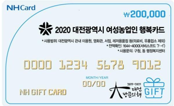 지원대상자로 선정된 여성농업인은 NH농협은행 지정영업점에서 자부담 2만 원을 입금한 후 20만 원의 기프트카드를 발급받아 대전시 일원 미용실과 화장품 판매점, 스포츠용품점 등 28개 업종에서 연말까지 사용할 수 있다.