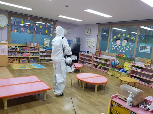 코로나19 감염 확산 예방으로 어린이집 휴원 기간이 장기화 되면서 긴급 보육율이 증가함에 따라 방역과 소독으로 안전한 환경에서 안심보육이 이루어 질 수 있도록 방역지원에 나섰다.