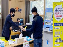 시는 민원 방문이 잦은 시청 민원실 입구에서 휴대용 손세정제와 도로명 홍보 리플릿을 민원인들에게 배부하며 코로나19 예방수칙 준수 및 위급상황 발생 시 도로명주소를 사용하도록 안내하고 있다.