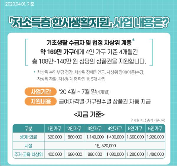지원 금액은 4개월분의 금액이 한 번에 일괄 지급되며, 1인 가구부터 6인 가구까지 수급 자격별, 가구 규모에 따라 최소 40만원에서 최대 192만원까지 차등 지급된다.