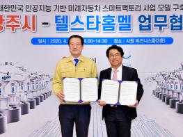 광주시와 텔스타홈멜은 7일 시청 비즈니스룸에서 업무협약을 체결하고 광주에 인공지능연구소와 생산공장 설립·운영 및 인공지능 기반 미래자동차 스마트팩토리 사업 모델 구축에 협력키로 했다.