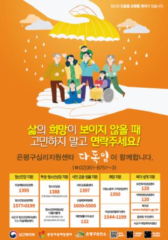 이에 자살빈발지역, 동주민센터, 복지관 등 생활밀착시설, 유동인구가 많은 지하철 역사 등에 "도움기관 정보"를 담은 포스터와 현수막을 게시하여 자살예방 집중 홍보를 실시하고 있다.