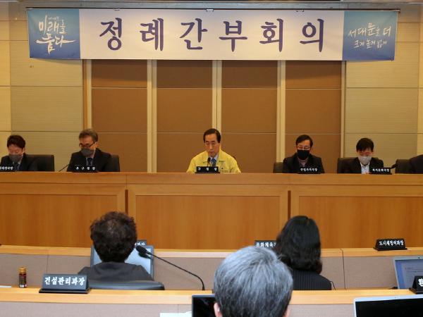 문석진 서대문구청장이 7일 구청 대회의실에서 열린 정례 간부회의에서 “코로나19 사태가 장차 지방정부의 역할에 대해 시사하는 바를 고민하고 구와 공무원이 어떤 노력을 해야 할지 행정 상상력을 발휘해 달라”면서 “시대의 변화를 읽고 미래를 준비해 달라”고 특별히 당부했다.