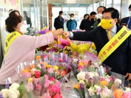 4일 장성군 진원?남면 농협 로컬푸드 직매장에서 ‘화훼농가 꽃사주기 화훼장터’가 열렸다. 코로나 사태로 어려움을 겪고 있는 화훼농가를 지원하기 위해 장성군이 마련했으며, 일요일인 5일에도 이어진다.
