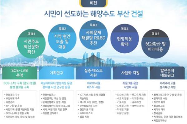 사업은 ▲SOS(Solution in Our Society)-Lab 구축 및 운영, ▲분야별 시민연구반 운영, ▲사회문제 해결형 사업화연계 기술 개발(R&BD) 지원, ▲테스트 및 사업화 지원 등 10개 세부사업으로 구성되며, 시의 당면한 사회문제인 해양분야의 사회문제를 해결하기 위해 사회문제해결 실험실(SOS랩) 구축과 문제발굴?해결 소프트웨어 서비스 구현, 현장적용 등 소프트웨어 서비스 연구개발의 기획부터 실증까지 전 과정을 수행한다. 특히, 리빙랩 및 민관산학연과 혁신 네트워크를 구축하여 협업과 융합?교류를 촉진, 파급력을 확대할 계획이다.