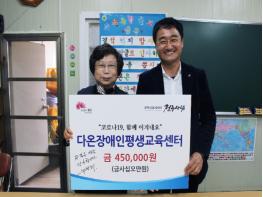 이날 전달된 성금은 다온장애인평생교육센터를 이용하는 성인장애인과 직원이 어려움을 함께 해결하려는 취지에서 십시일반 모아 마련된 것으로 그 의미가 크다.