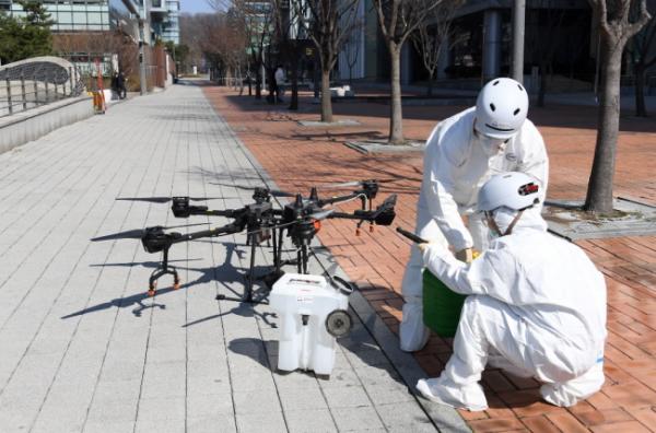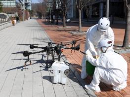 시는 지난 3월 5일부터 지속적으로 확진자 이동 동선 중 지상방역을 진행하기 어려운 장소와 확진자 치료시설, 공공시설물을 중심으로 드론으로 항공방역을 하고있다. 항공방역의 작업의 안전을 위해 스피커와 카메라가 장착된 드론을 활용해 방역 전 시민에게 안내 및 이동을 요청하고 위험요인이 없는지 확인 후 방역액제를 살포하고있다.