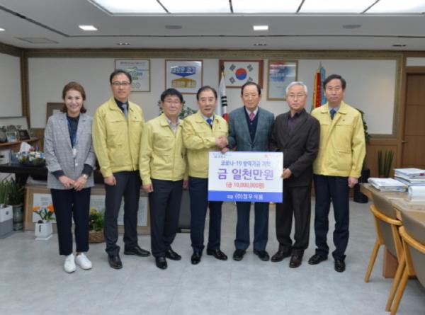 포천시에 본사를 두고 있는 ㈜청우식품(회장 박윤구)은 코로나19 극복을 위해 애쓰고 있는 포천시에 방역기금 1천만원을 기탁했다.