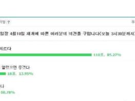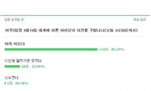 지난 4월 7일 지역 SNS 중 가장 활발하게 활동하는 ‘헬로여주맘’ 카페를 통해 실시한 긴급 여론조사는 여주5일장 상인회와의 면담에 앞서 긴급하게 시민들의 여론을 묻기 위해 실시한 것으로 전체 응답자 520명 중 82.7%인 430명이 ‘아직 이르다’를, ‘열려도 된다’는 의견에는 87명 15.7%, ‘잘 모르겠다’는 3명 0.6%로 나타났다.